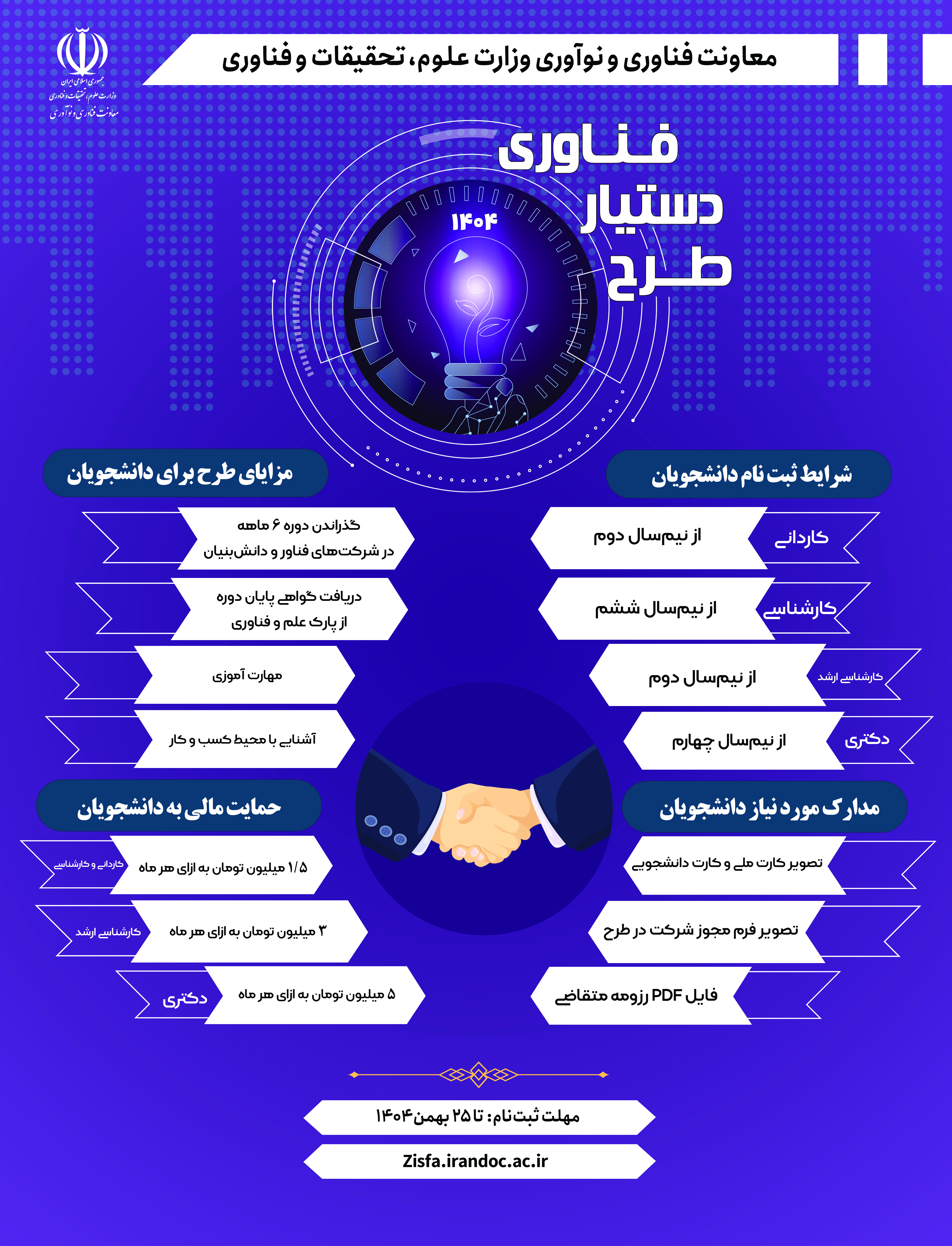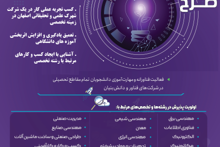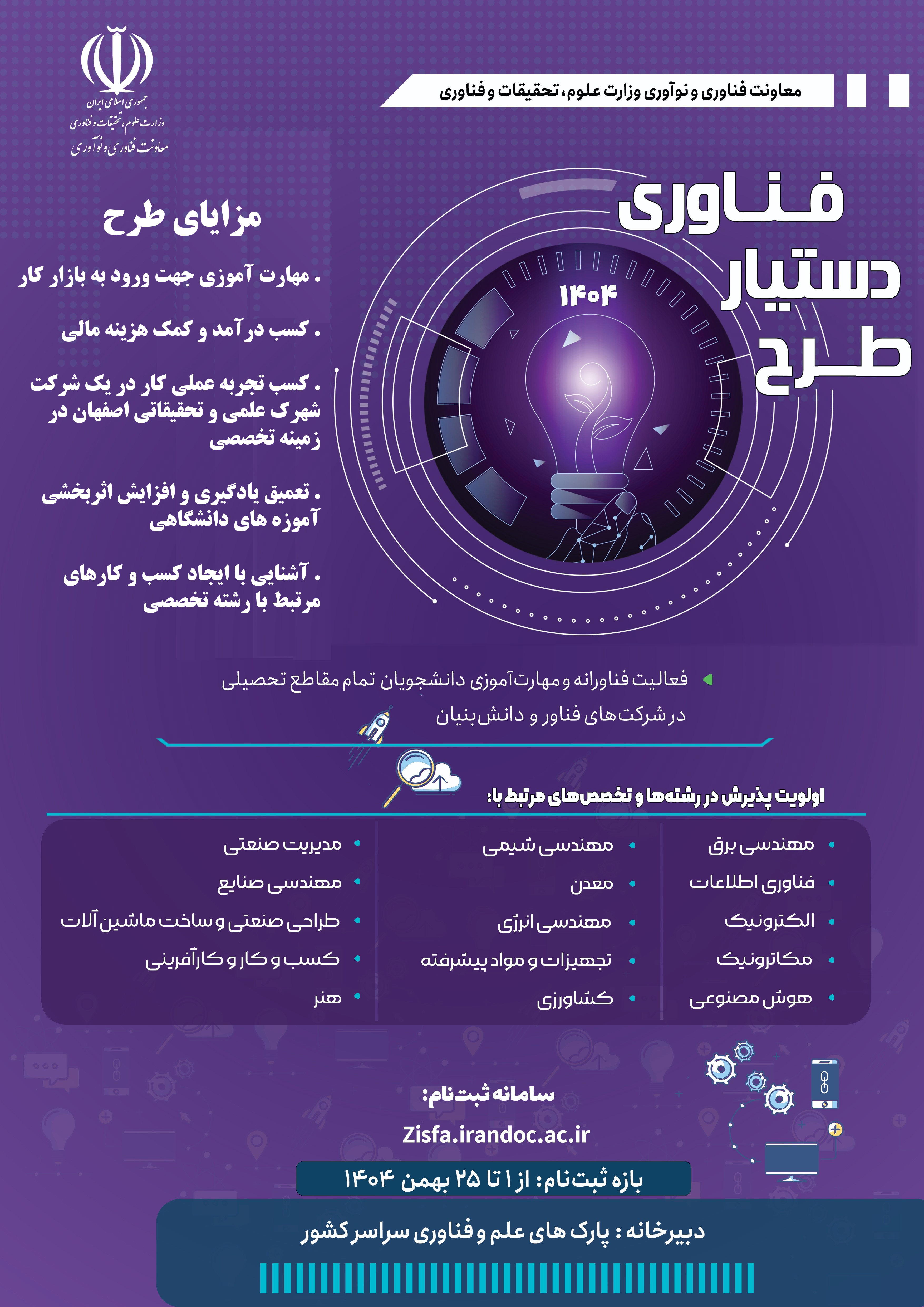 در راستای اجرای «طرح دستيار فناوری» دوره چهارم كه با همكاری مشترك شهرك علمی و تحقيقاتی اصفهان و دانشگاه صنعتی اصفهان انجام می گردد، لطفا فایل های پیوست با دقت مطالعه گردد.